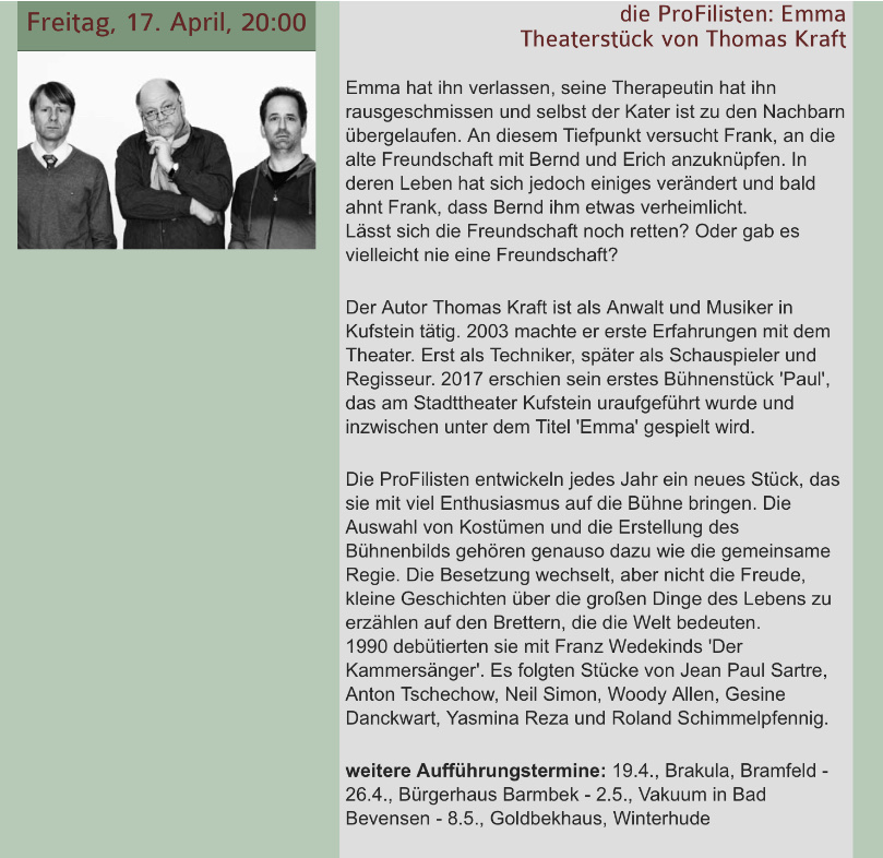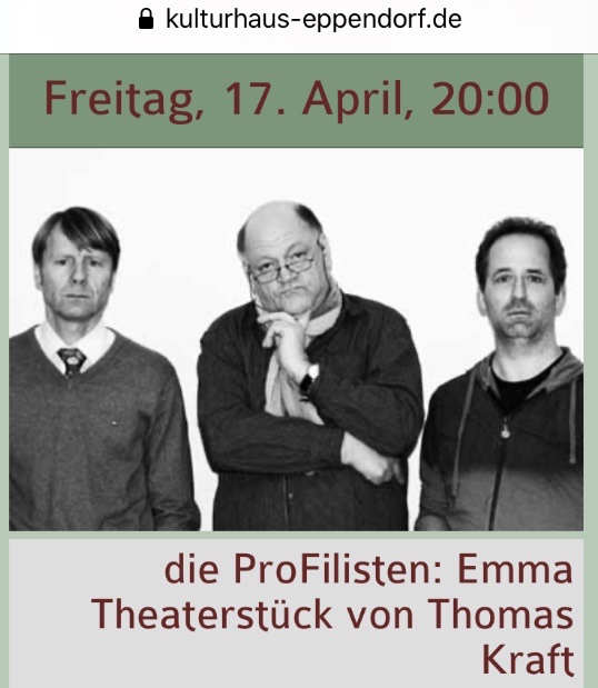 Die ProFilisten, eine engagierte Hamburger Theatergruppe, wird EMMA ab 17.4.2020 insgesamt fünf Mal in Hamburg und Bad Bevensen aufführen. Es ist die erste Produktion der neuen Fassung des Stücks, weshalb ich sehr gespannt bin.